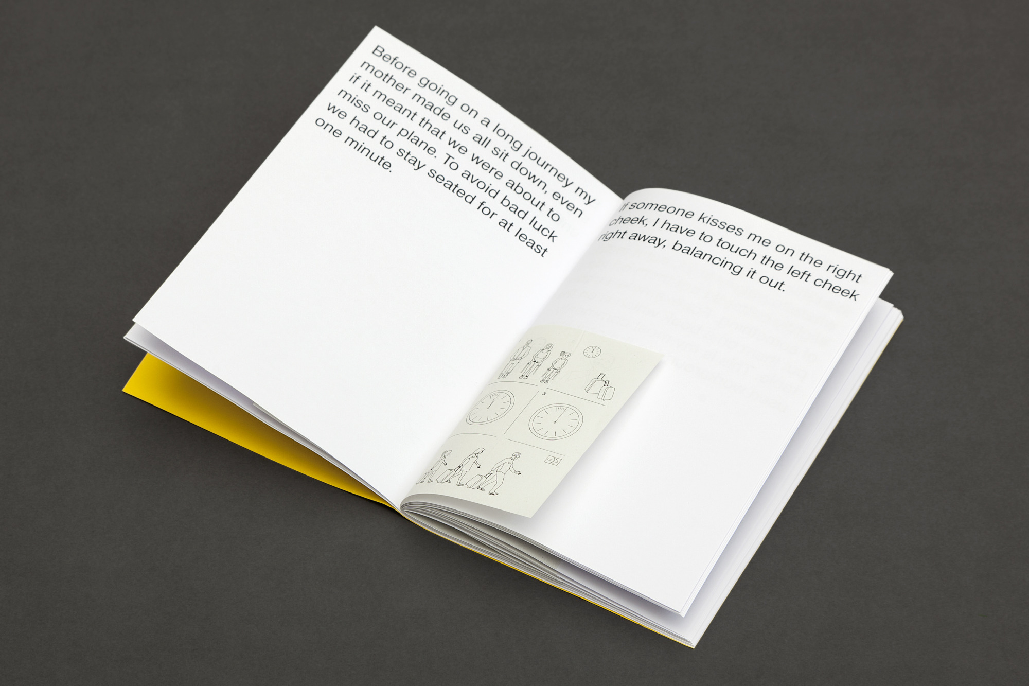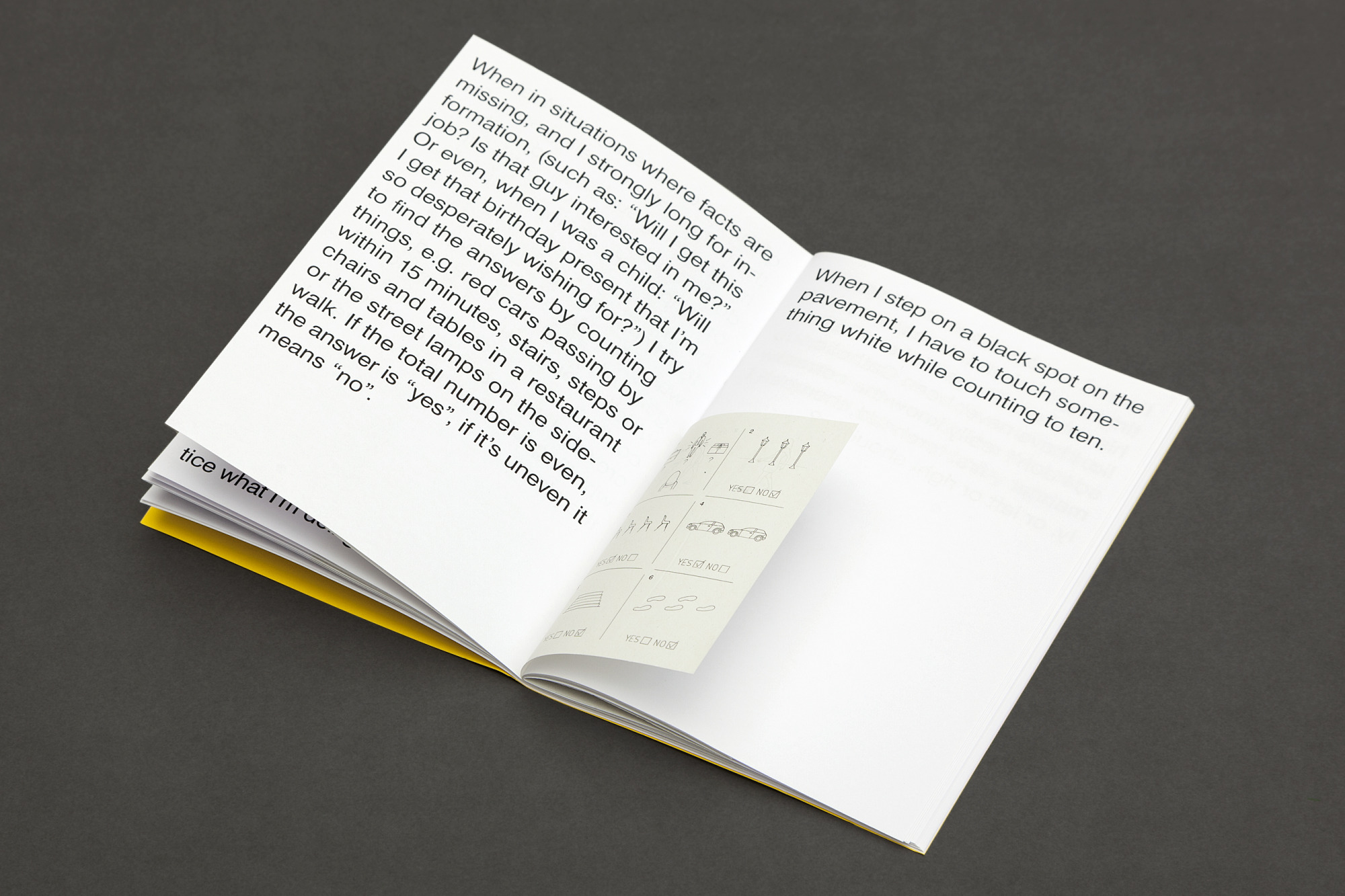 Superstitions: A compilation of personal superstitions which were collected from friends and strangers. Some are personalised derivatives of common superstitions, while others are entirely new inventions. Some date back to childhood experiences; others are from more recent times. Some of them are simple; others highly complex. But they are all based on the common ground of supremely personal attempts in the construction of meaning.